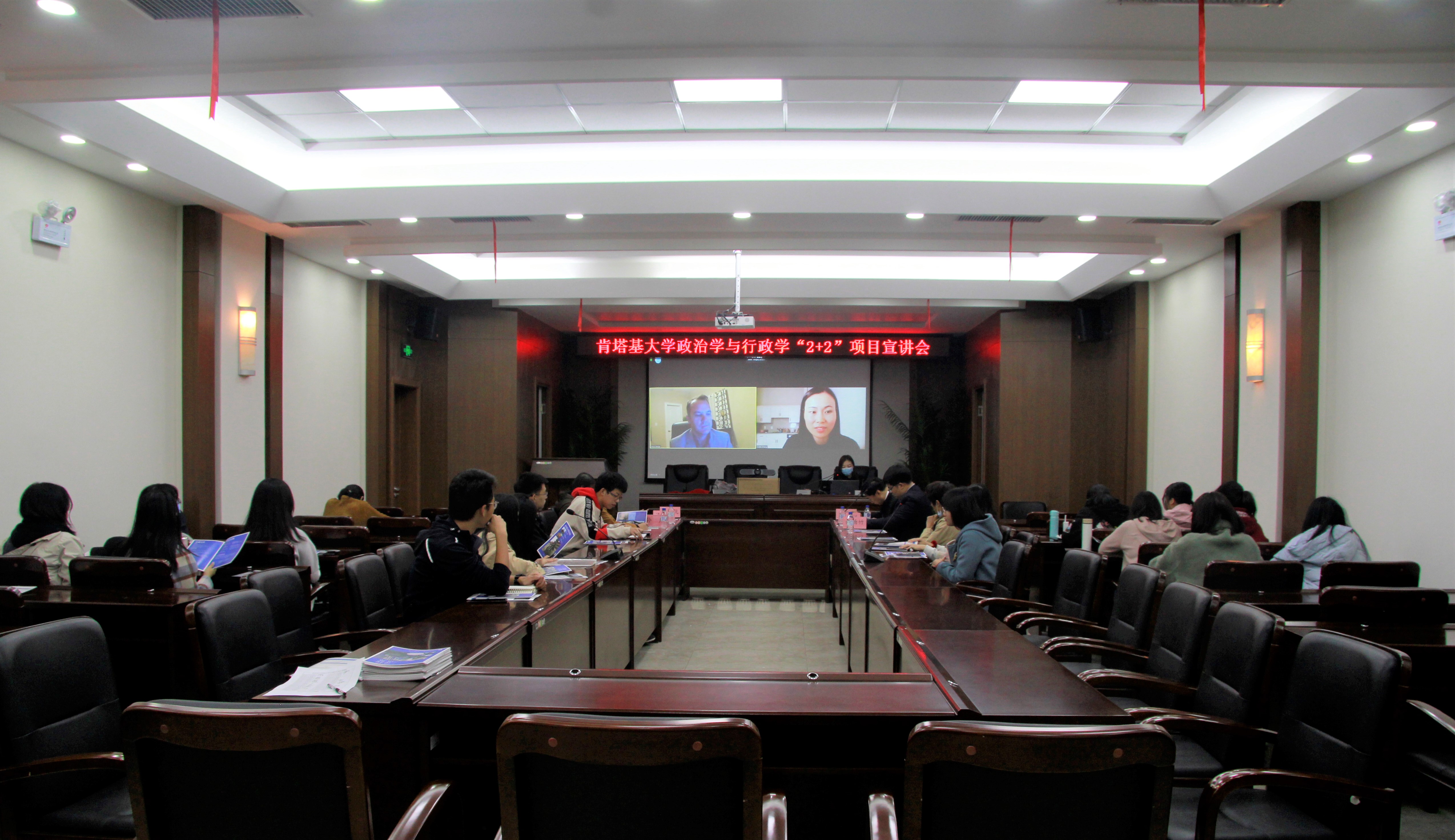 肯塔基大学文理公司副经理杰西•赫奇(Jesse Hedge)通过线上平台,为同学们详细介绍了肯塔基大学的校园概况、疫情期间的防护措施与授课方式、2+2项目的基本架构与申请要求等项目基本信息。员工大使苏伟伦向同学们简要分享了申请留学的心得与在美学习期间的感受与体会。员工大使曹幸汇着重说明了参与2+2项目需要注意的选课、住宿、同外方教授的日常沟通等问题。最后,肯塔基大学孔子公司外方经理修华静代表肯塔基大学方面师生期待同学们能够在会后积极咨询交流。