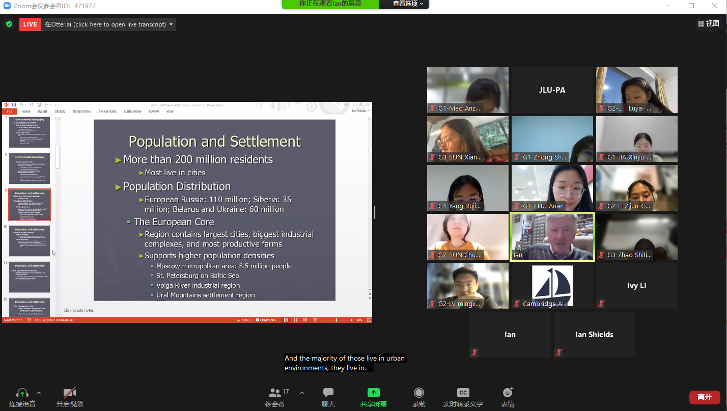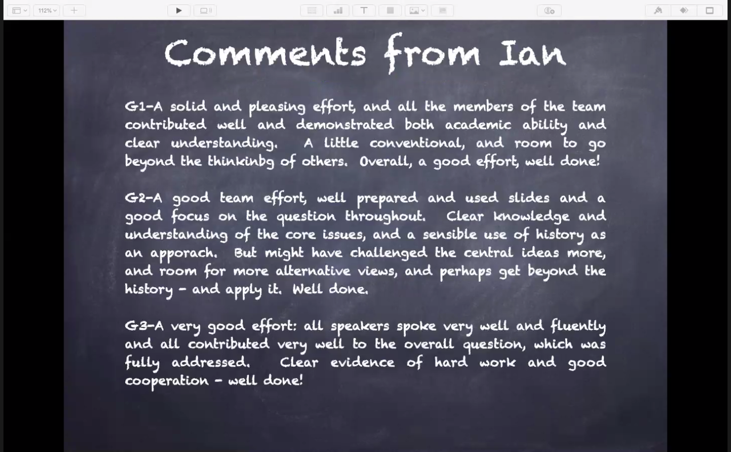 5月27日,3个小组分别就各组负责的结课主题进行展示分享。第1组分析了在全球权力转移的世界中软实力、硬实力和巧实力的重要性,第2组则以大英帝国为例分析了帝国的崩溃原因,第3组则对一个经济体或政权占据统治地位的时代消失的原因进行了探索。展示结束后,Ian Shields教授对3个小组的各自表现给出针对性评价。