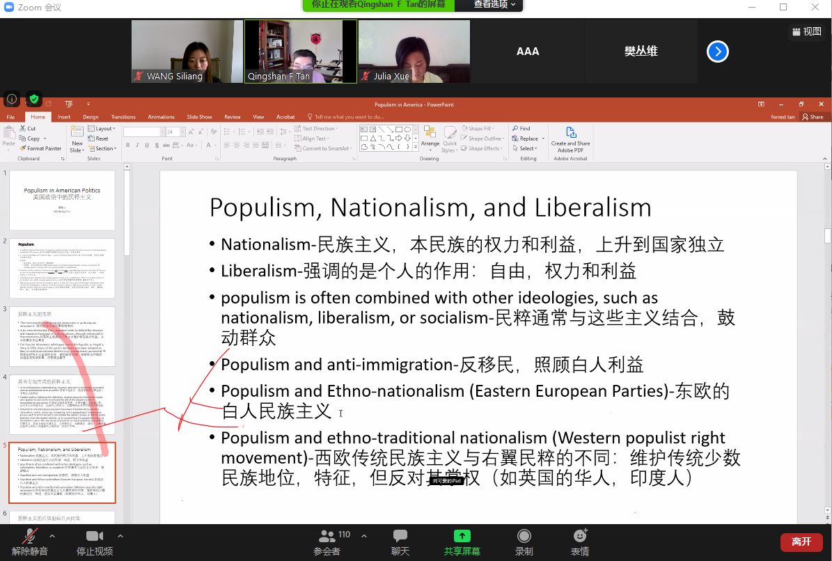 讲座伊始,谭青山教授首先解释了民粹主义的含义、性质与具体表现。之后,谭青山老师重点解释了民粹主义、民族主义与自由主义概念上的区别。谭青山老师还从地域视角对比了欧洲与美国民粹主义产生的不同诱因及发展的不同方向。