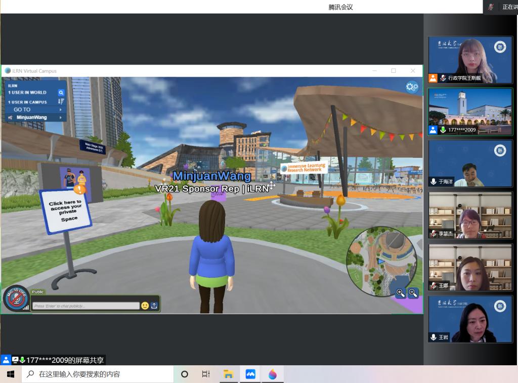 随后,王敏娟教授以第四次线上教育E-Learing革命作为切入点,引出元宇宙概念建立在扩展现实(XR)技术的基础上,包含增强现实(AR)、虚拟现实(VR)、混合现实(MR)与360°照片(视频),并通过实例短片讲解了AR、VR、MR的概念区分与技术特征。敏娟教授还向与会师生现场演示了Virbela iLRN Campus软件的实际操作界面,使大家切身感受了新兴技术中的教学开展形态,并希望同与会师生一起拭目以待教育的未来发展。