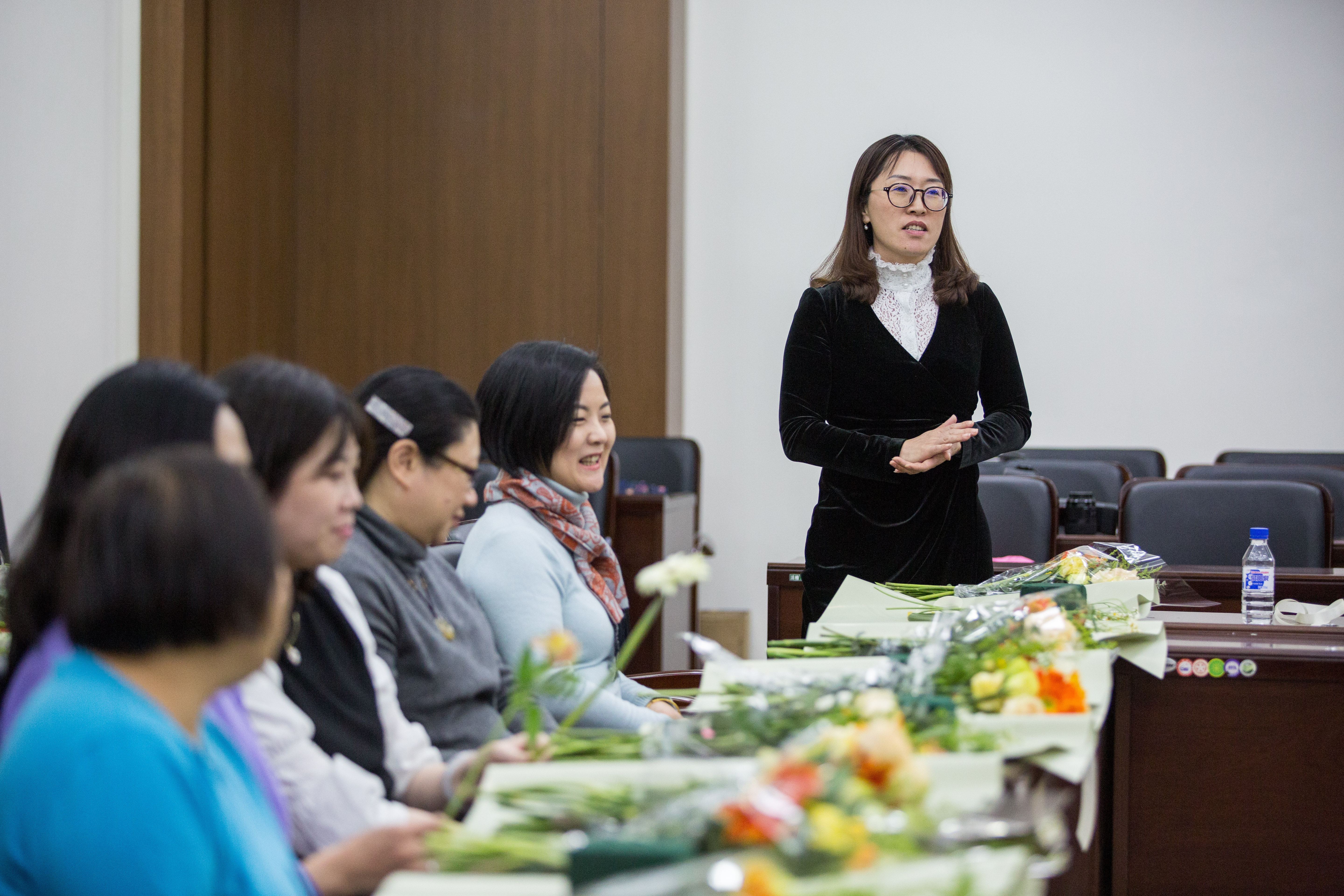 通过花艺师细致的讲解,老师们对扶郎、玫瑰、纽扣菊、康乃馨等常见花卉的花形花语和养护技巧有了深入的了解。随后,老师们纷纷拿起手旁的各式鲜花,在花艺师的示范和指导下,裁花纸、卷花泥、除花叶、插花枝,修形剪边,好不热闹。没过多久,心灵手巧的老师们便将沁人心脾、别具匠心的花卉作品一齐呈现。一捧捧争奇斗艳的花束,一张张笑语盈盈的面庞,将活动现场装点得花团锦簇、喜气洋洋,使之充满了朝气蓬勃、生机盎然的春天气息。