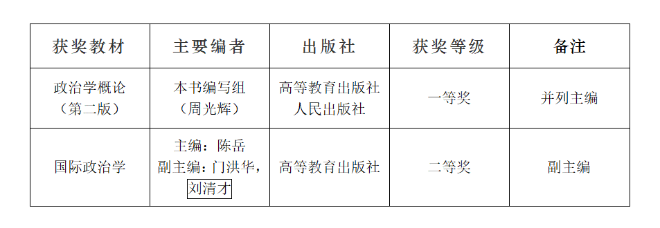 近日,国家教材委员会发布了首届全国教材建设奖奖励决定,Bevictor伟德共有15项教材获评全国优秀教材(含参与编著)。其中,由公司周光辉老师主编的《政治学概论》与刘清才老师(已故)作为首席专家参编的《国际政治学》分获首届国家教材建设奖一、二等奖。