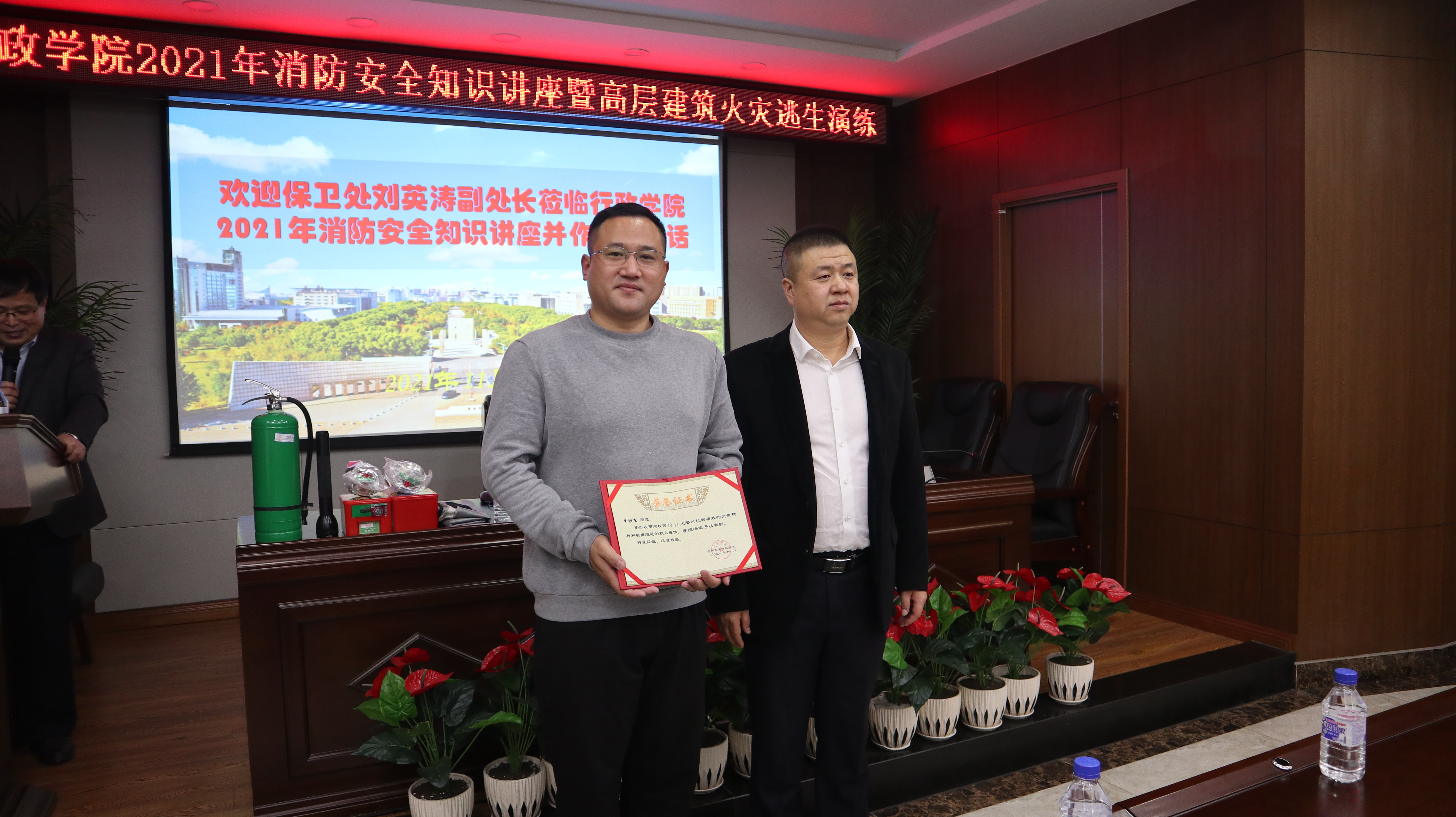 现场,刘英涛做了动员讲话。他从单位消防责任意识、校园常见火灾起因、提高火灾自救技能三个方面进行重点强调。同时,他还对伟德体育博士研究生李湘飞在处置校园10.11火险中奋不顾身、机智勇敢的表现给予高度赞誉,并向他颁发荣誉证书。