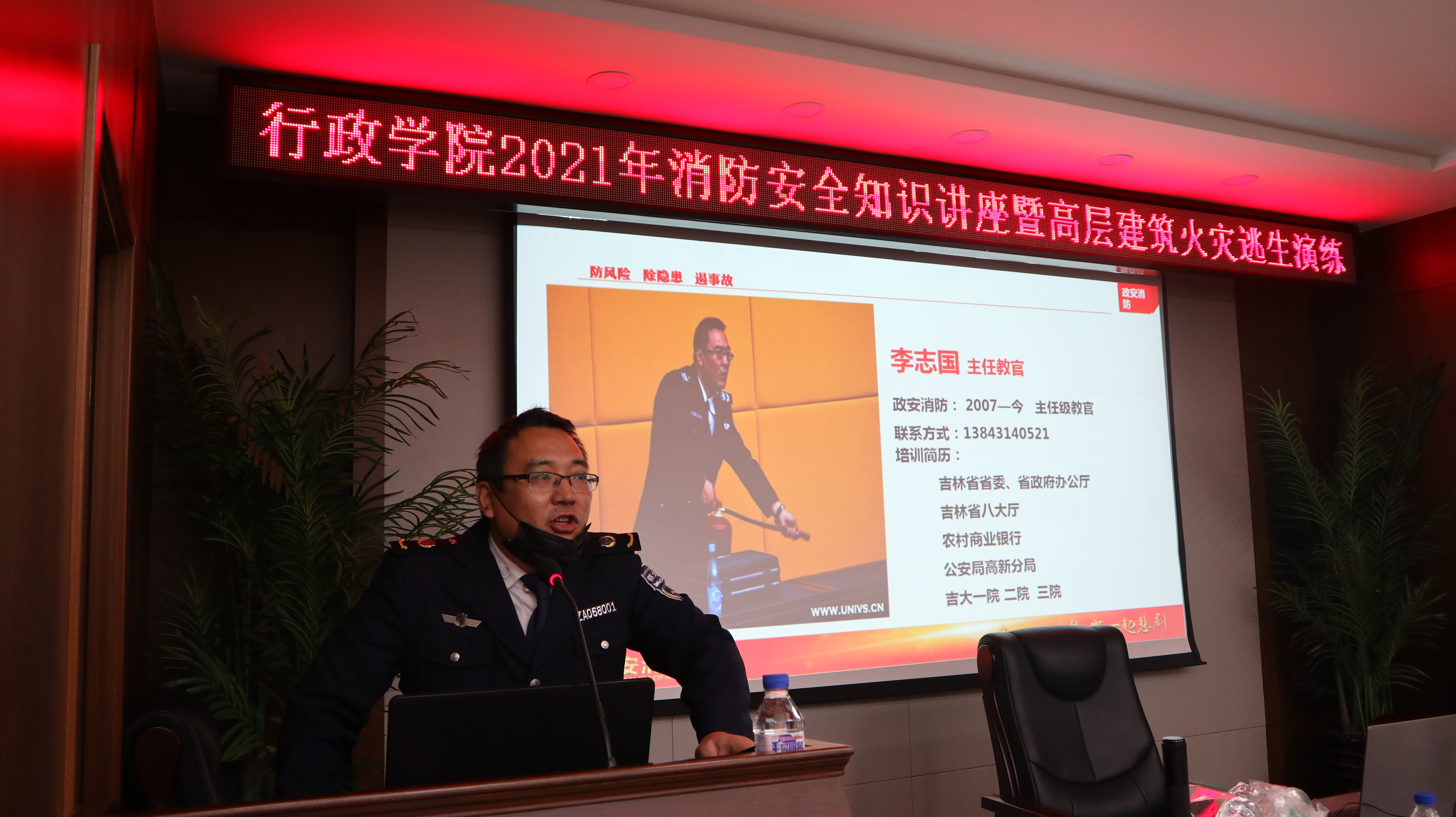 为落实2021年消防工作任务,增强师生的消防安全意识,于11月18日上午,伟德体育在东荣大厦B303会议室举办消防安全知识讲座暨高层建筑火灾逃生演练。吉林省政安消防公司主任李志国主讲,校保卫处刘英涛副处长、公司党委书记马景惠、副书记兼副经理张洁及近五十名师生代表参与了此次培训讲座,副经理季洪涛主持。