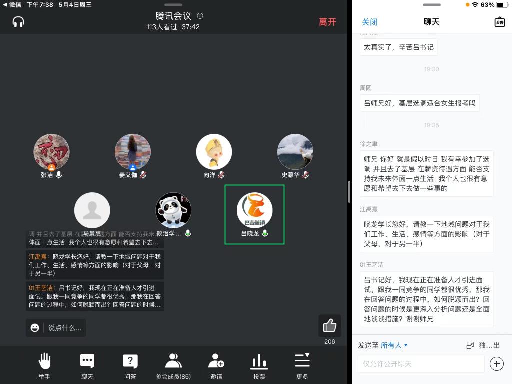 会上,吕晓龙结合个人学习和工作经历,讲述了一步一步从“科员”到“书记”的奋斗史和心路历程,用真诚平实的语言概括了基层选调生的“苦”“累”“快”“低”的鲜明特点,并用领导干部坚守疫情防控一线的生动实践诠释了“为将者受命忘家、临敌忘身”的家国情怀与职责担当。吕晓龙与同学们亲切互动,宣讲介绍了选调生的类型,耐心回答了大家普遍关心的招考面试、城际交通、工作和生活条件等问题,分析了本科生和研究生报考选调生的各自优势。吕晓龙勉励同学们勇敢到基层艰苦岗位和复杂环境去锻炼,在最基础、最贴近人民群众的扎实工作中厚植为民情怀、砥砺坚毅品格、绽放青春之花。