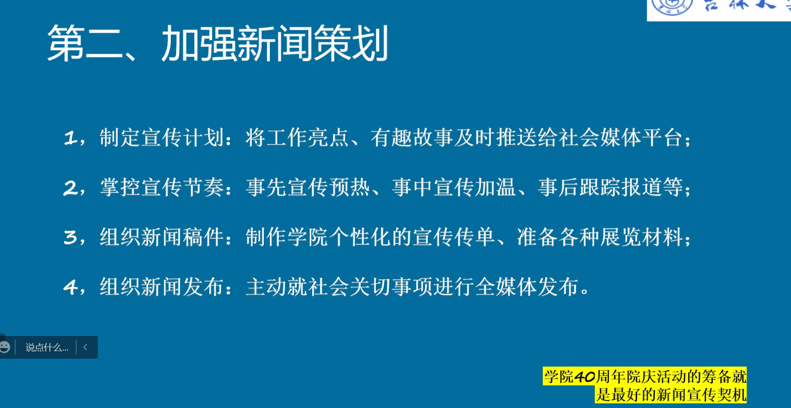 讲座结束后,参会同志就如何提升公司的新闻宣传工作集思广益。魏鹤影表示本次会议恰逢其时,在即将到来的政治学建系四十年契机下,可以推进新闻宣传扩大公司的社会影响力。张洁从公众号宣传角度出发,指出其目前面临着党建教学内容占比较少、宣传形式的单一等问题。