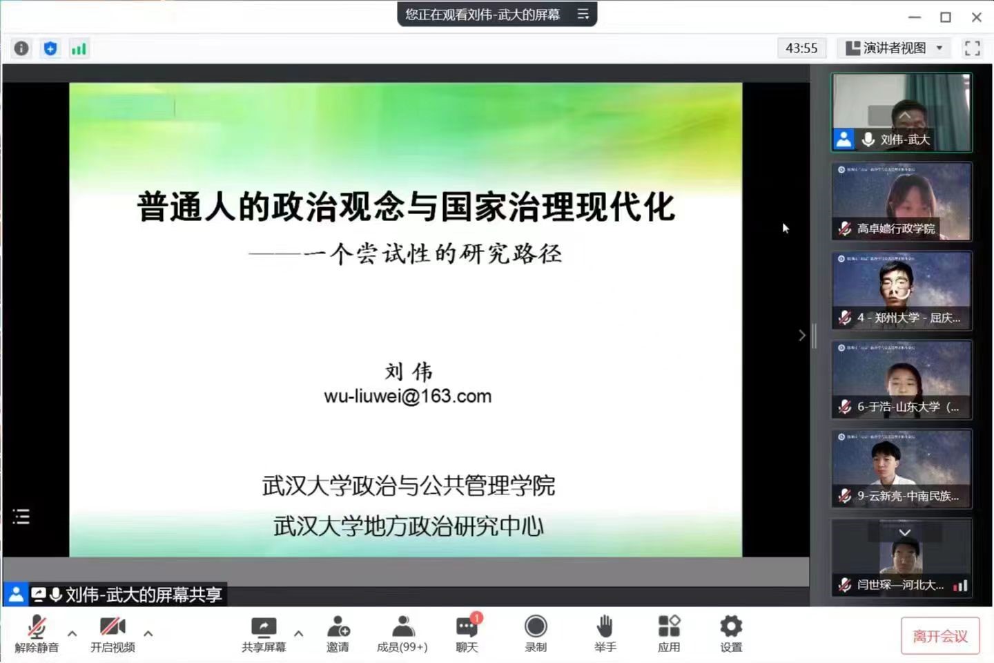 论坛嘉宾、武汉大学政治与公共管理公司副经理(主持工作)刘伟教授以“普通人的政治观念与国家治理现代化”为主题,从分析当代中国基层生活中的现象切入,通过将普通人的政治观念带入政治讨论,形成普通人的政治理论,并进一步阐释分析了中国普通人的政治基本倾向、普通人政治观念与国家治理多方面具体工作的关系,为大家带来了开放式的学术分享。