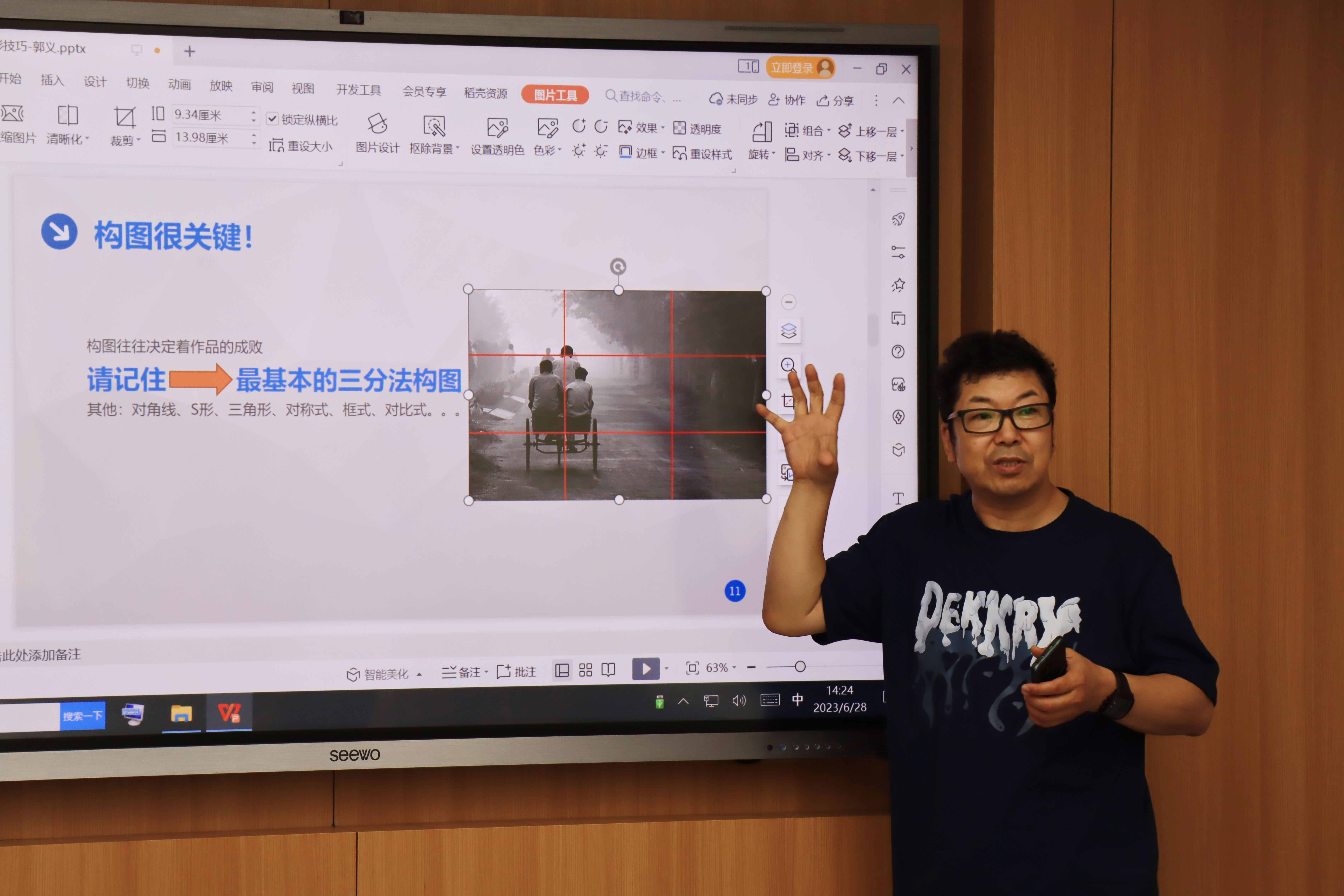 郭义首先介绍了手机摄影,指出在智能手机不断推广普及的时代背景下,手机摄影已经成为未来的趋势。他指出,摄影的关键在于平衡摄影技术与摄影内容的关系,通过突出摄影的表现主体讲述真实的现场感。他重点讲解了构图、光影、对焦等手机摄影的关键技巧,并指出手机摄影常见的问题。活动中,郭义同老师们热切交流,讲解摄影的技巧与注意事项并示范,带领老师们一步步实现摄影技术入门,老师们纷纷拿起手机,在示范指导下相互分享手机摄影的心得体会,在答疑解惑中对手机摄影增进了认识与了解,现场活动气氛非常热烈,活动取得预期效果。