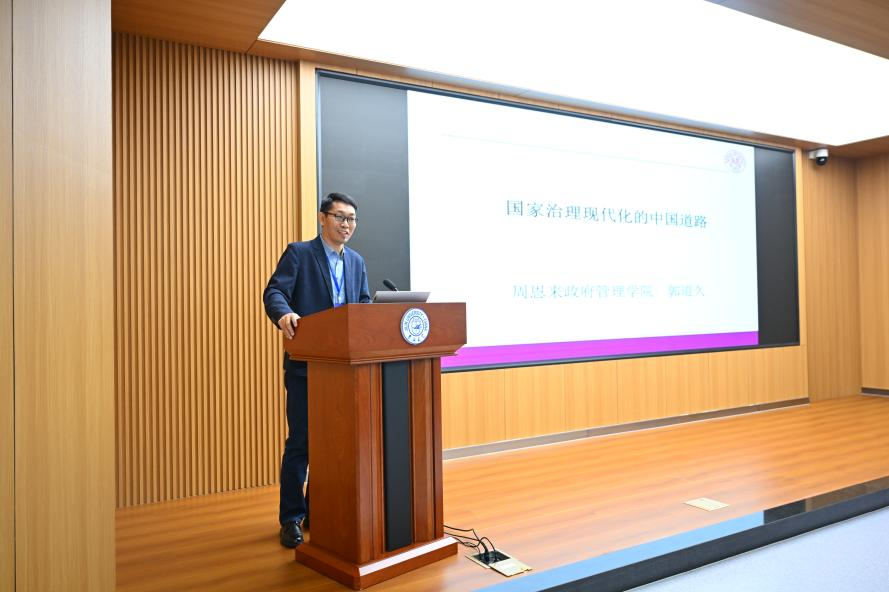 论坛开幕式结束后,南开大学周恩来政府管理公司副经理郭道久作了题为《国家治理现代化的中国道路》的主旨报告,伟德体育教授薛洁担任主持人。郭道久在国家治理现代化的背景下,对中国特色社会主义治理体系进行了深入剖析。他强调了人民中心的方法论与党的领导核心地位的本质特征,并指出要充分发挥国家与社会的积极性。在此基础上,郭道久创新性地提出了常态与弹性治理的双轮驱动治理模式,为我国治理体系和治理能力现代化提供了新的思路和方向。
