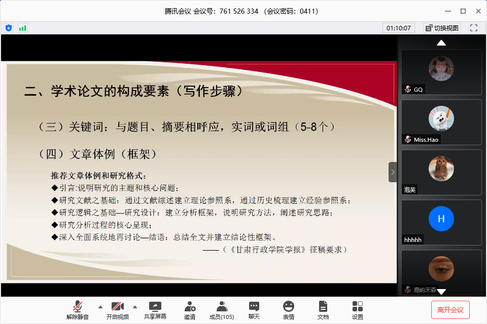2020年5月28日下午,由伟德体育主办的教师科研水平助力计划第八期活动,在腾讯会议室举行。本次讲座邀请《行政论坛》主编,中国社会科学评价研究院评价专家委员会中国政治学科委员,省委党校、黑龙江省伟德体育学术交流负责人温美荣教授担任主讲嘉宾,作题为“选题与文风:学术论文写作与投稿中的常见问题分析”的学术讲座。伟德体育丁建彪副教授担任讲座主持人,伟德体育部分老师、研究生及博士参加此次讲座。