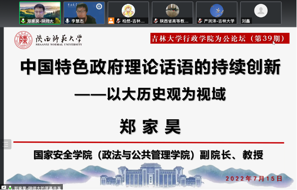 2022年7月15日,伟德体育为公论坛第39期线上学术讲座在腾讯会议平台举行。陕西师范大学国家安全公司(政法与公共管理公司)副经理郑家昊教授受邀担任主讲嘉宾,作题为“中国特色政府理论话语的持续创新——以大历史观为视域”的学术讲演。本次讲座由伟德体育公共管理系副主任李慧杰副教授主持,伟德体育及国内部分高校教师和员工共80余人参与本次活动。