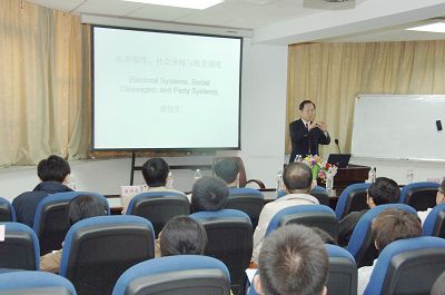 谢教授首先指出,当前世界各国都有不同的政党制度,大致分为一党制、两党制和多党制,导致各国采取不同的政党制度的原因,除了各国不同的政治、文化、历史、种族、地理环境之外,选举制度和社会分歧是最主要因素。紧接着,谢教授介绍了当今西方国家最常见的几种选举制度,包括多数代表制、比例代表制和混合制。谢教授认为,多数代表制会使得小的政党难以生存,因而造成了一党制或者两党制;而比例代表制使得小党的生存空间比较大,容易引起小党林立,出现多党制。谢教授强调,不同的选举制度并非创造了不同的政党,而是通过对各政党,特别是小党的限制与否,因而导致了政党制度的多样化。再接着,谢教授讲了影响政党制度的第二个主要因素——社会分歧。谢教授认为,近代欧洲民族国家的建立和工业革命的兴起,导致了西方国家国内社会冲突和分歧增多,主要表现在因阶级、宗教、城乡和地域以及族群等因素引起的社会矛盾和冲突的加剧,正是因为社会分歧的广泛存在,导致了各种政党的产生,也使得政党的种类五花八门。伴随着后工业社会的到来,环保、人权和政治参与等因素对社会分歧的影响也越来越大,一些以环保、人权为主旨的新政党也得以出现,加大了政党的多样性,但是与此同时,政党之间的差异性也在逐渐减小,跨党投票的现象越来越多。最后,谢教授就美、英、意、德、法、日、韩等国以及中国台湾地区的政党制度进行了比较分析,并解答了在座同学的提问。