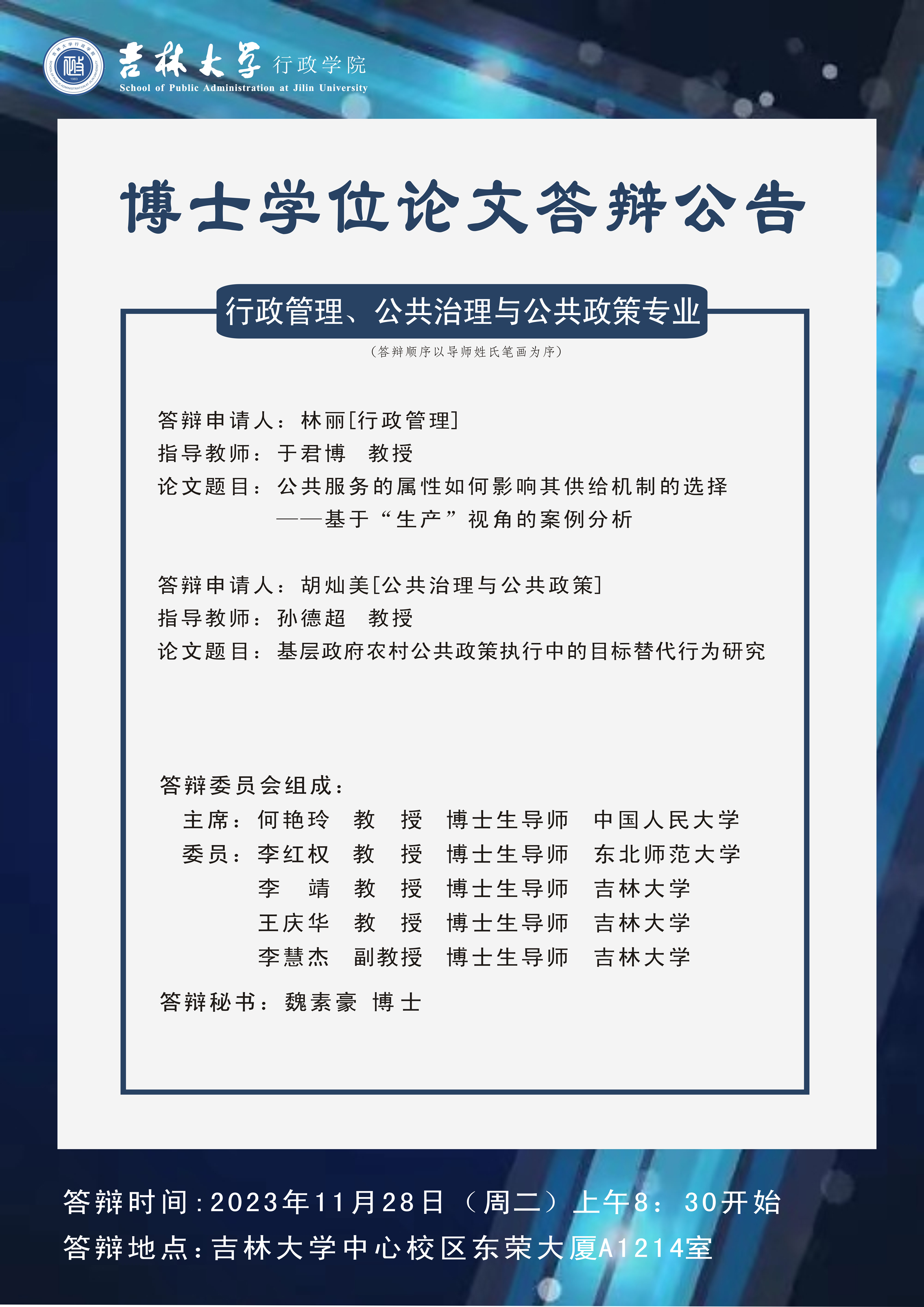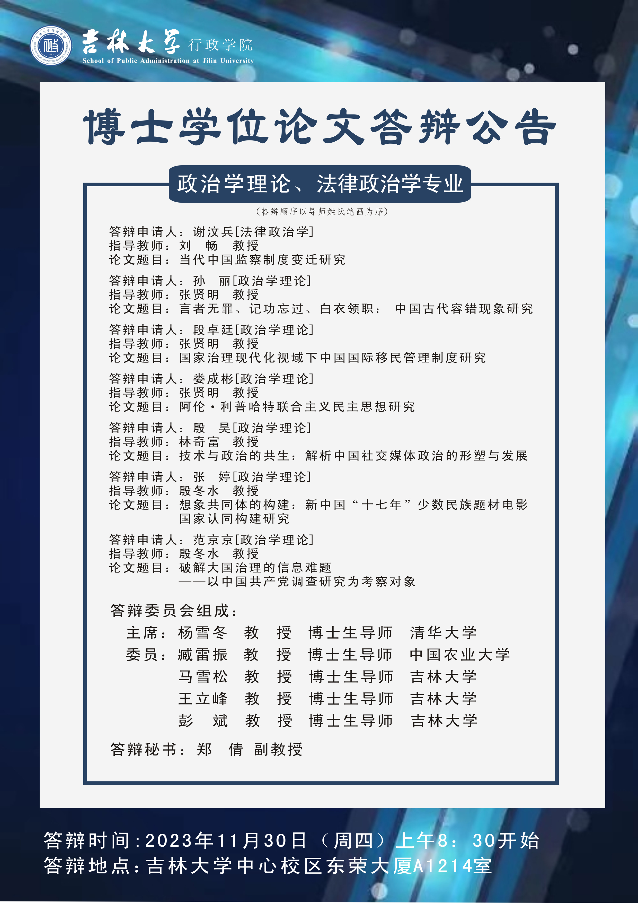 第一组:行政管理、公共治理与公共政策专业-博士学位论文答辩:2023年11月28日(周二)上午08:30开始,答辩地点:Bevictor伟德中心校区东荣大厦A1214会议室