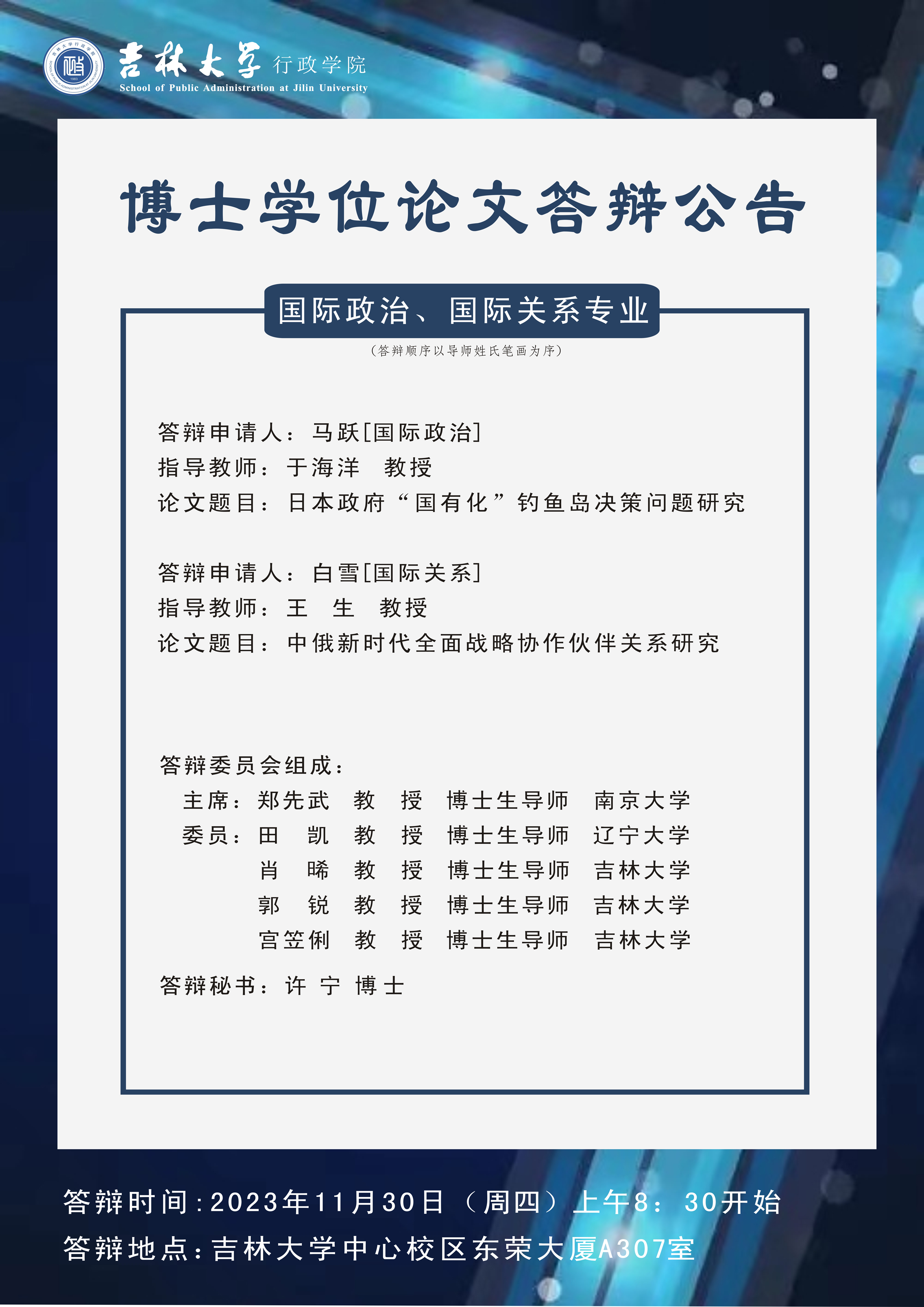 第二组:国际政治、国际关系专业-博士学位论文答辩:2023年11月30日(周四)上午08:30开始,答辩地点:Bevictor伟德中心校区东荣大厦A307会议室