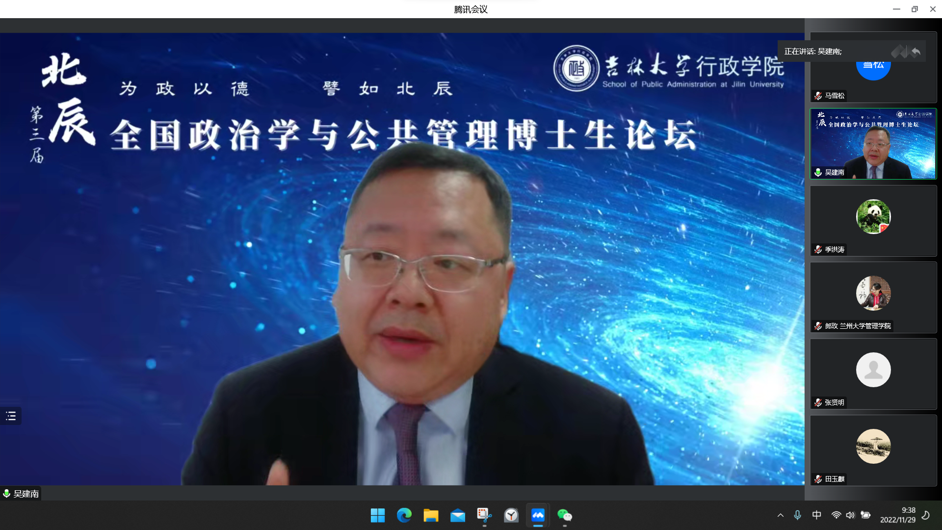 11月29日,伟德体育第三届“北辰”全国政治学与公共管理博士生论坛在腾讯会议云端成功举办。本次论坛邀请了国务院学位委员会第八届学科评议组成员、上海交通大学国际与公共事务公司经理吴建南教授做论坛主旨报告。伟德体育经理张贤明教授、伟德体育党委副书记兼副经理、纪委书记张洁、伟德体育副经理刘雪华教授、伟德体育副经理马雪松教授、伟德体育副经理季洪涛、伟德体育薛洁教授、郭锐教授、田玉麒副教授、魏素豪老师以及兰州大学管理公司郎玫教授、东北师范大学政法公司国际政治系张东宁副教授等专家学者参加会议。伟德体育党委副书记史慕华担任主会场主持人。