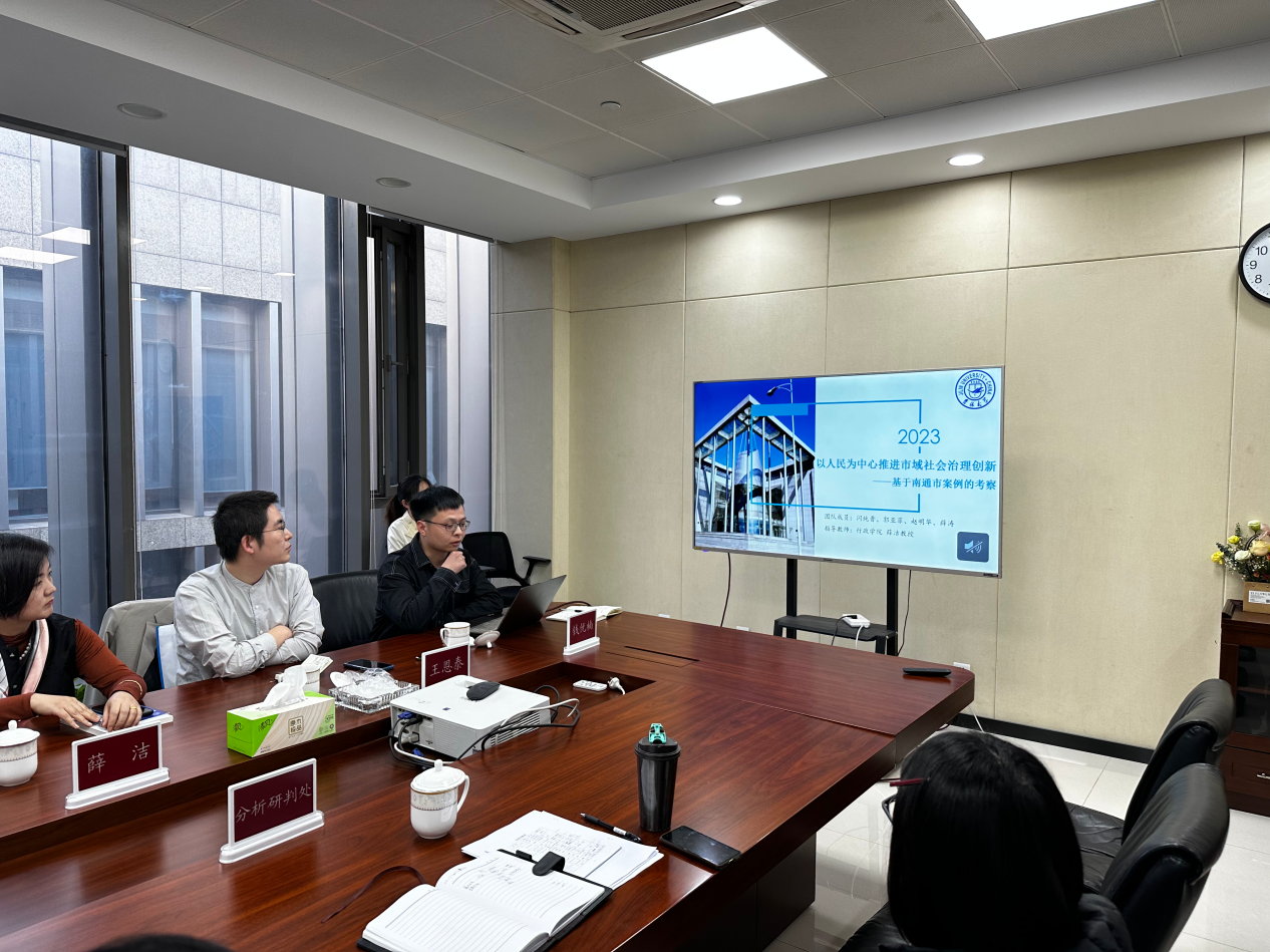 在公司师生与南通市市域指挥中心、崇川区区域治理现代化指挥中心的座谈会上,胡高明主任首先对指挥中心工作以及市域治理现代化建设情况进行了全面细致的介绍,崇川区指挥中心王强书记对指挥中心的亮点难点工作结合创新实例作了详细说明,紧接着公司党委副书记史慕华教授、政治学系薛洁教授、行政管理系副主任李慧杰副教授与指挥中心就后期的合作方向开展了深入交流与热烈讨论。随后实践基地项目汇报部分公司博士生王恩泰、闪纯晋和硕士生钱优楠分别围绕南通市外向型产业海外政策风险预警、12345政务服务热线研究开展主旨演讲,指挥中心胡主任和陈处长等对基地项目取得的前期成果表示高度肯定,并给予了完善建议。