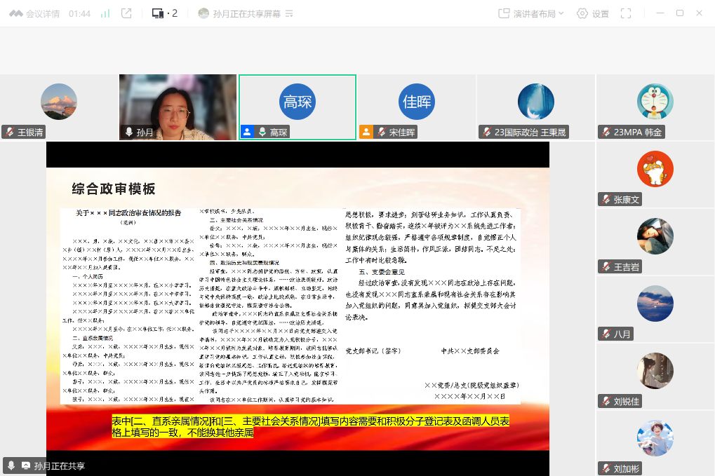 孙月下一阶段的综合政审、发展对象确定、集中培训等事宜进行了细致讲解,并就关键环节的时间节点、材料准备及注意事项进行了详细说明