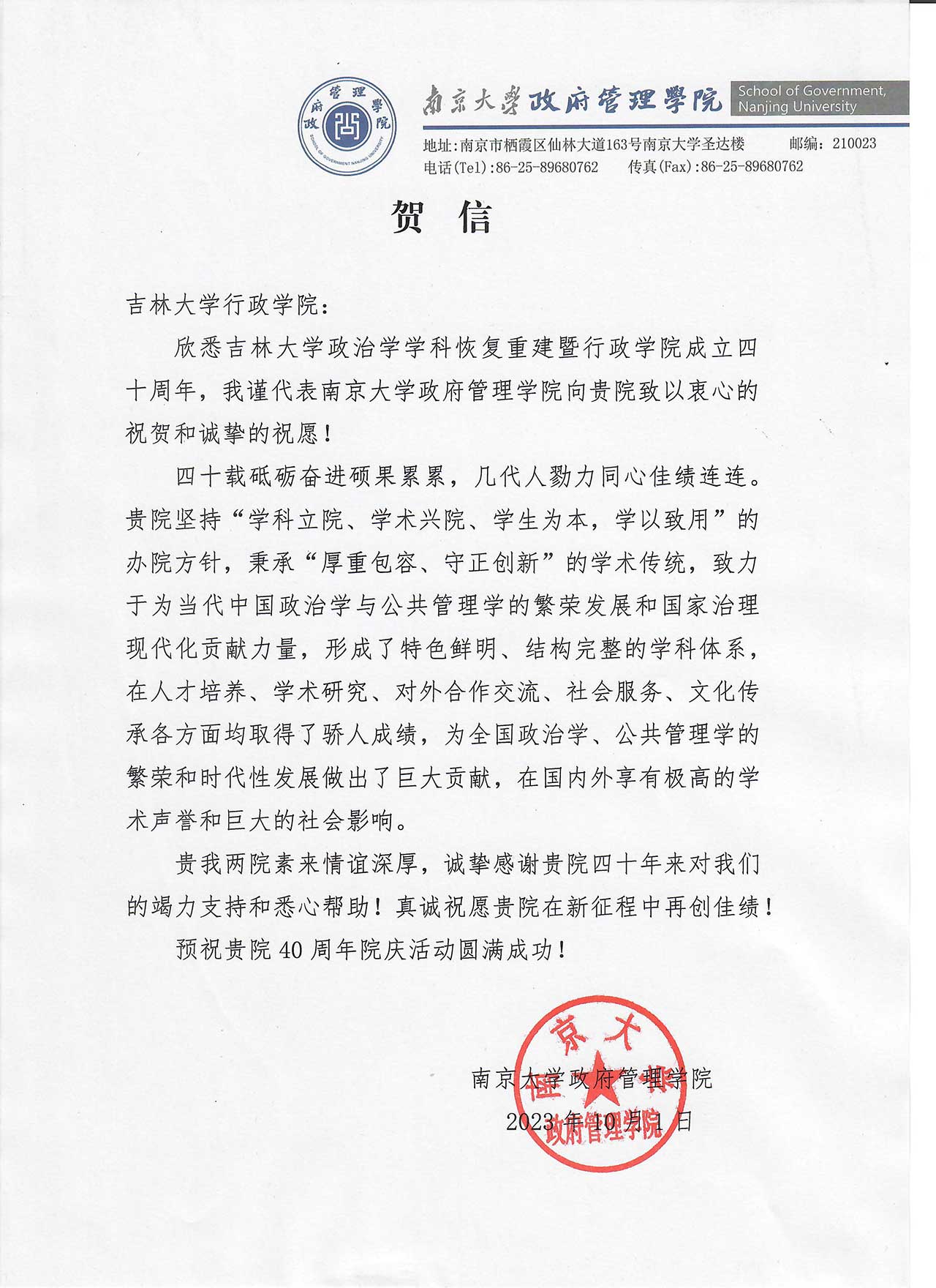 南京大学政府管理公司的贺信