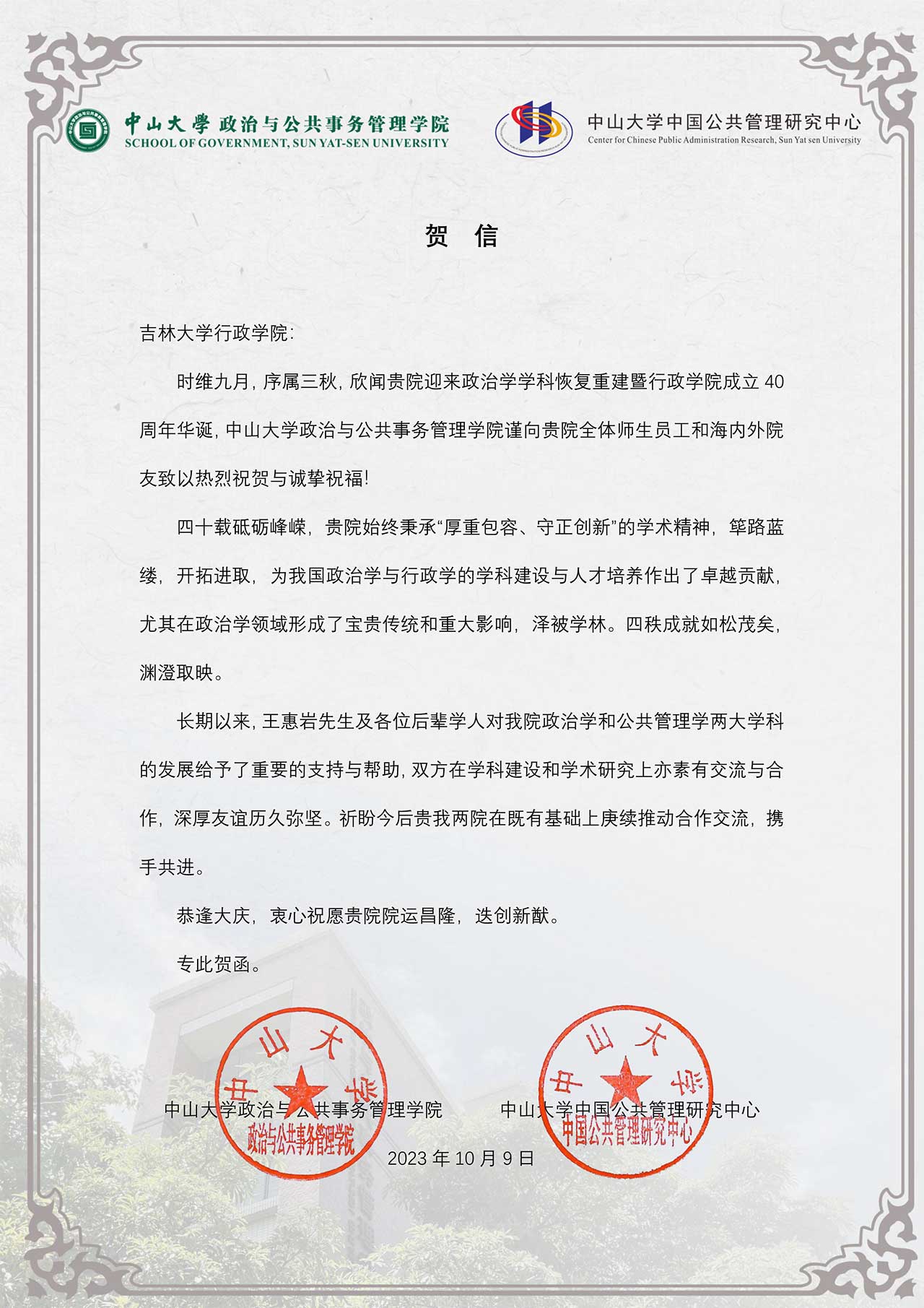 中山大学政治与公共事务管理公司、中国公共管理研究中心的贺信