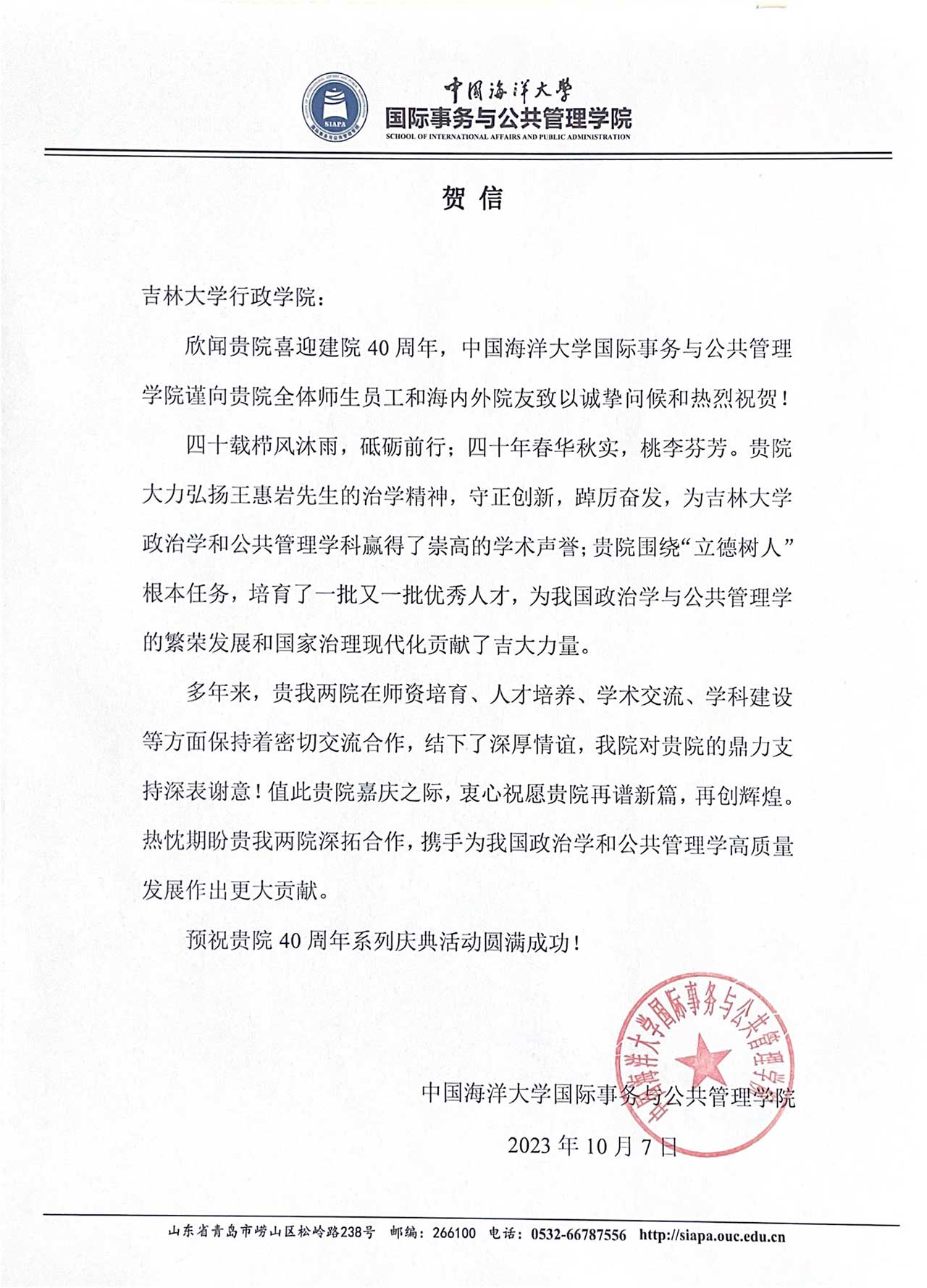 中国海洋大学国际事务与公共管理公司的贺信