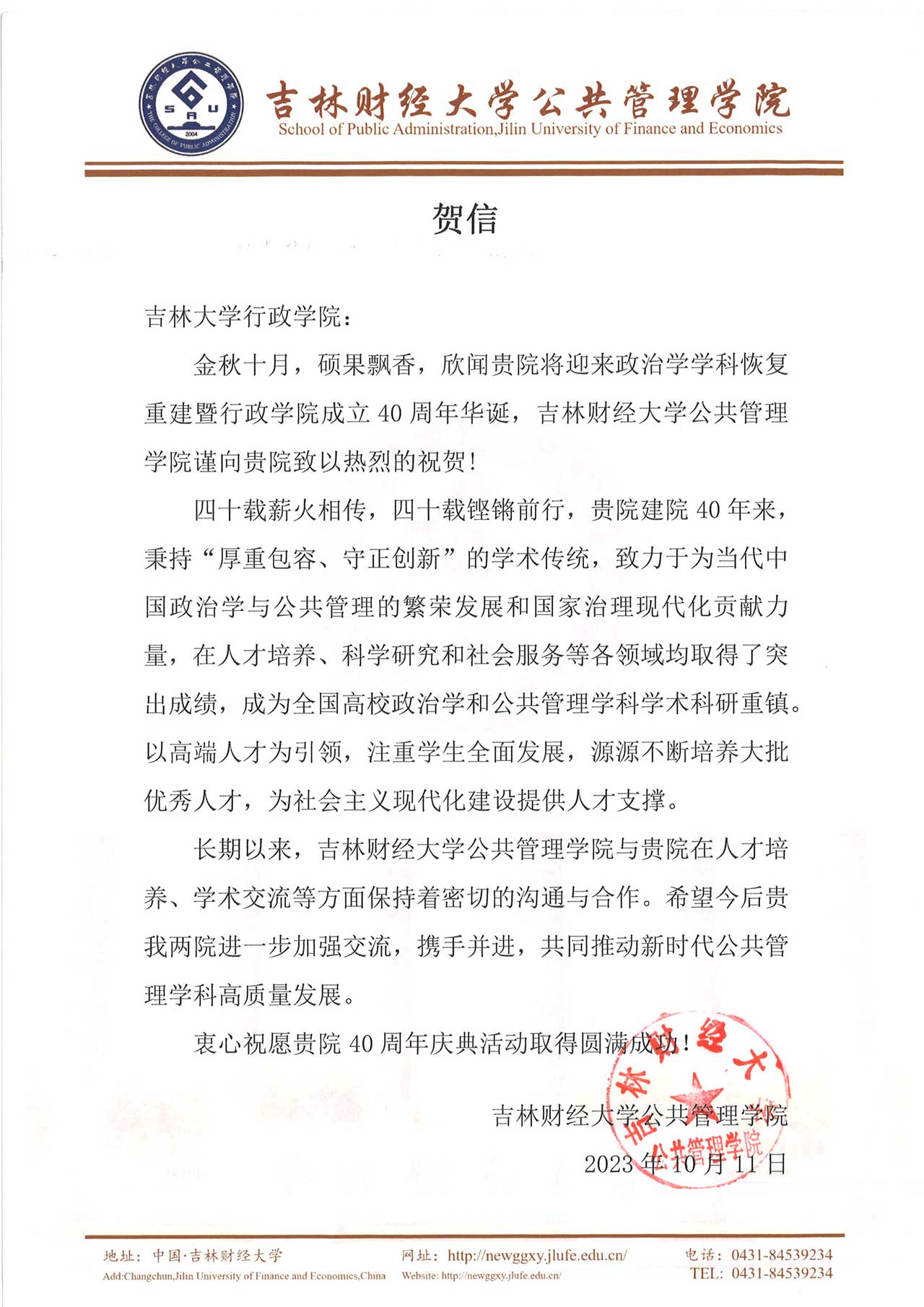 吉林财经大学公共管理公司的贺信