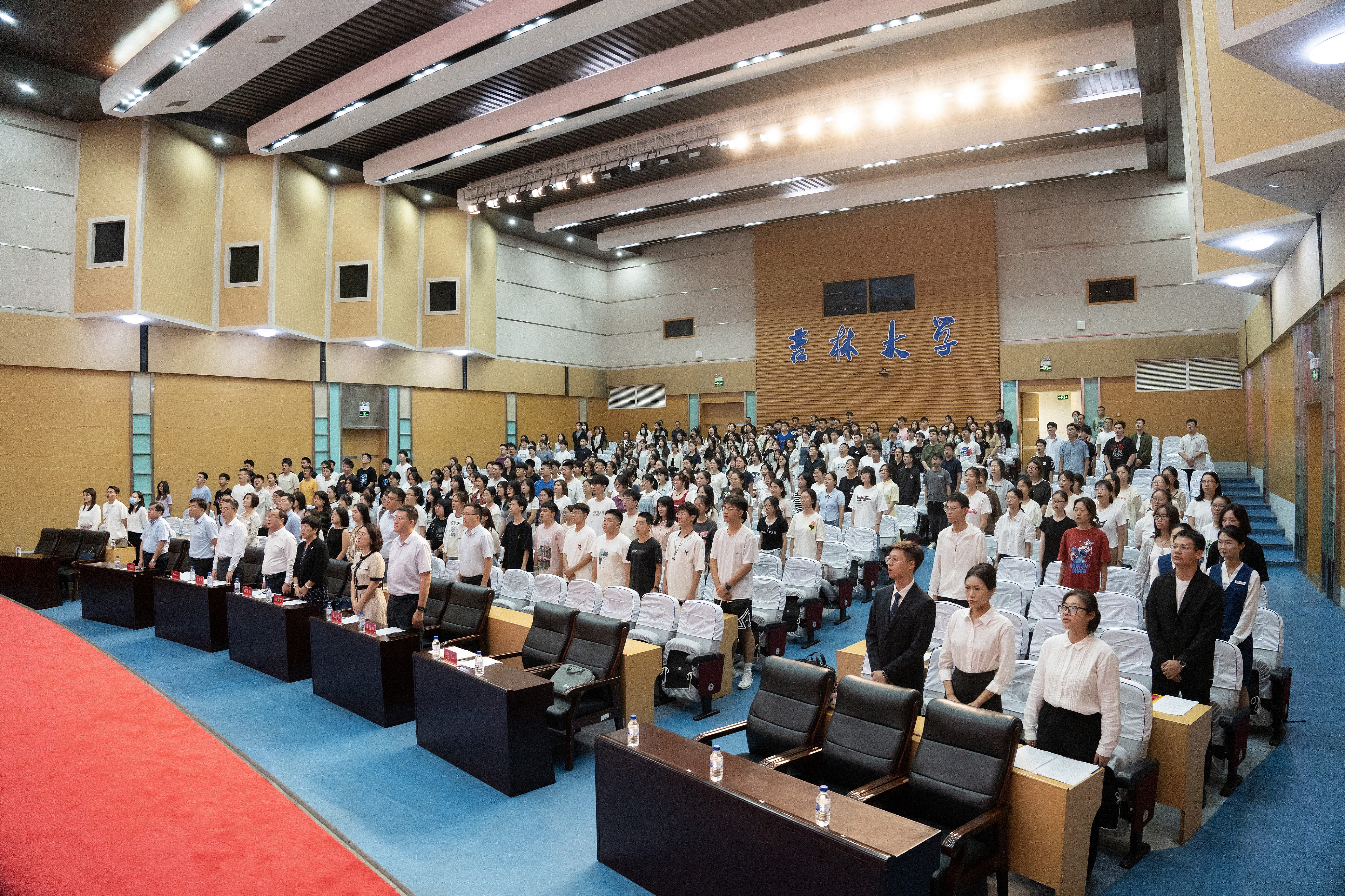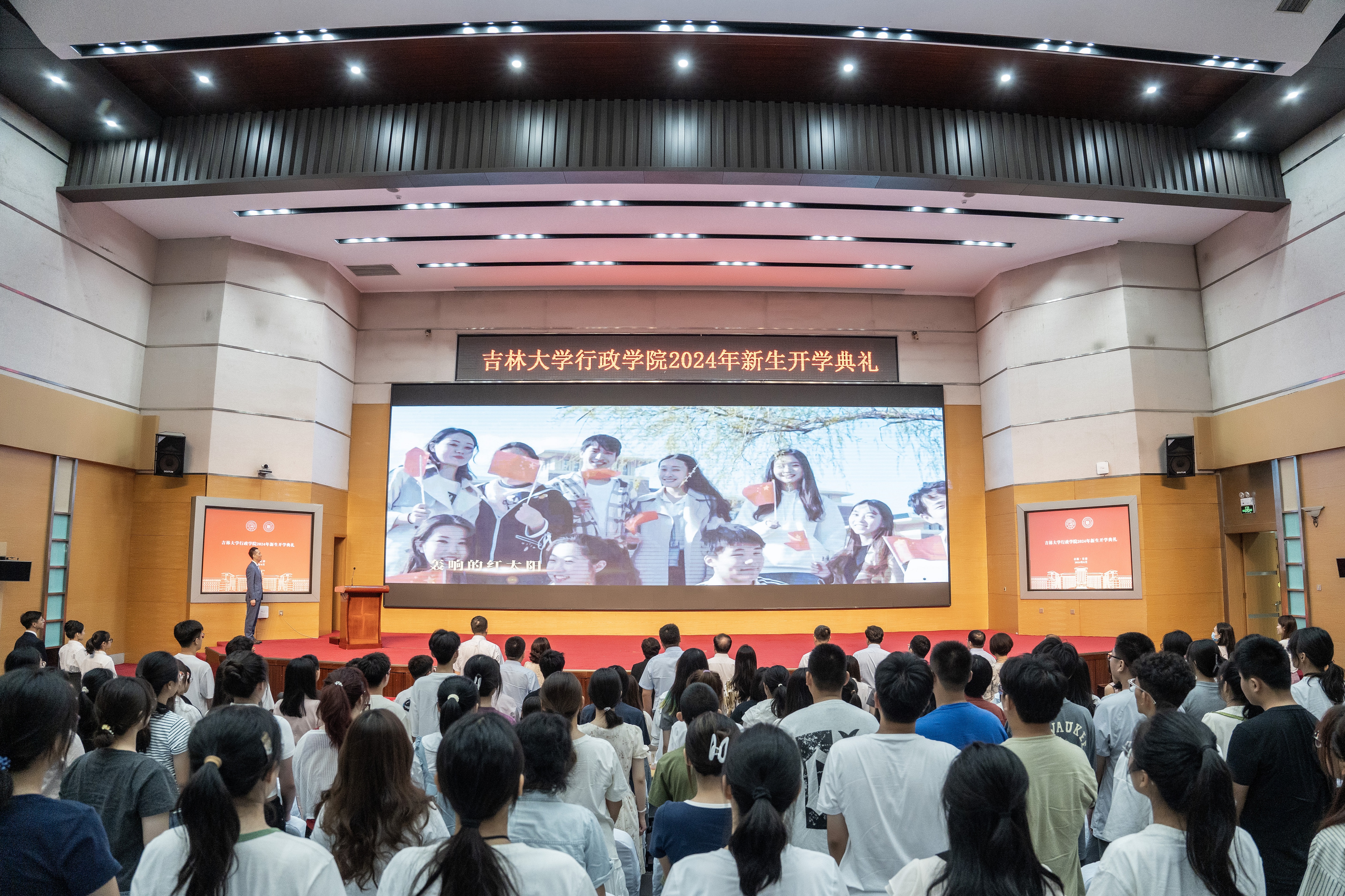 全体参会人员齐唱国歌,典礼氛围激昂庄重而又喜庆活泼。